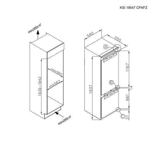 Холодильник KSI 19547 CFNFZ – современный высокотехнологичный встраиваемый бытовой прибор, оснащенный цифровым дисплеем и сенсорным управлением. Общий объем холодильника составляет 267 литров, из которых 200 литров предназначены для холодильной камеры, а 67 литров – для морозильной. Современная технология охлаждения No Frost устраняет необходимость в периодической разморозке, что значительно упрощает уход за прибором. Равномерное распределение температуры обеспечивается благодаря динамическому охлаждению: специальный вентилятор перемешивает воздух, что также способствует более быстрому охлаждению продуктов.